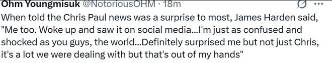 哈登说:“我也很意外,我醒来后在社媒看到了(这一消息)......我和你们一样困惑与震惊,全世界都一样......。这确实让我猝不及防,但不只是克里斯的事,最近我们要应对的变故太多了——只是这些都超出了我能掌控的范围。”