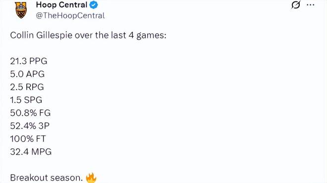 凭借一手不俗的三分球,吉莱斯皮在2025年夏天和太阳签下一份1年230万美元合同。因为杰伦·格林长期养伤,吉莱斯皮获得了比较多的上场时间,而他也抓住了难得的机会展现自己的能力。本赛季的吉莱斯皮打了22场比赛,场均出战26.8分钟,得到13.4分3.8篮板5.0助攻1.2抢断,投篮命中率44.6%,三分命中率44.2%,罚球命中率83.3%。过去4场比赛,吉莱斯皮场均得到21.3分5.0助攻,投篮命中率50.8%,三分命中率52.4%,罚球命中率100%。